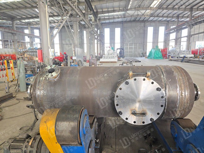在制造過程中,項目團隊嚴格執(zhí)行相關技術規(guī)范和質量控制要求,從原材料檢驗、筒體成型到焊接組對,每一道工序均進行全過程把控。設備主體采用臥式結構,整體布局合理,法蘭接口、人孔及工藝開口設置科學,既滿足工藝運行需求,也便于后期檢修與維護。焊接工藝成熟穩(wěn)定,焊縫質量可靠,為設備長期穩(wěn)定運行提供了有力保障。